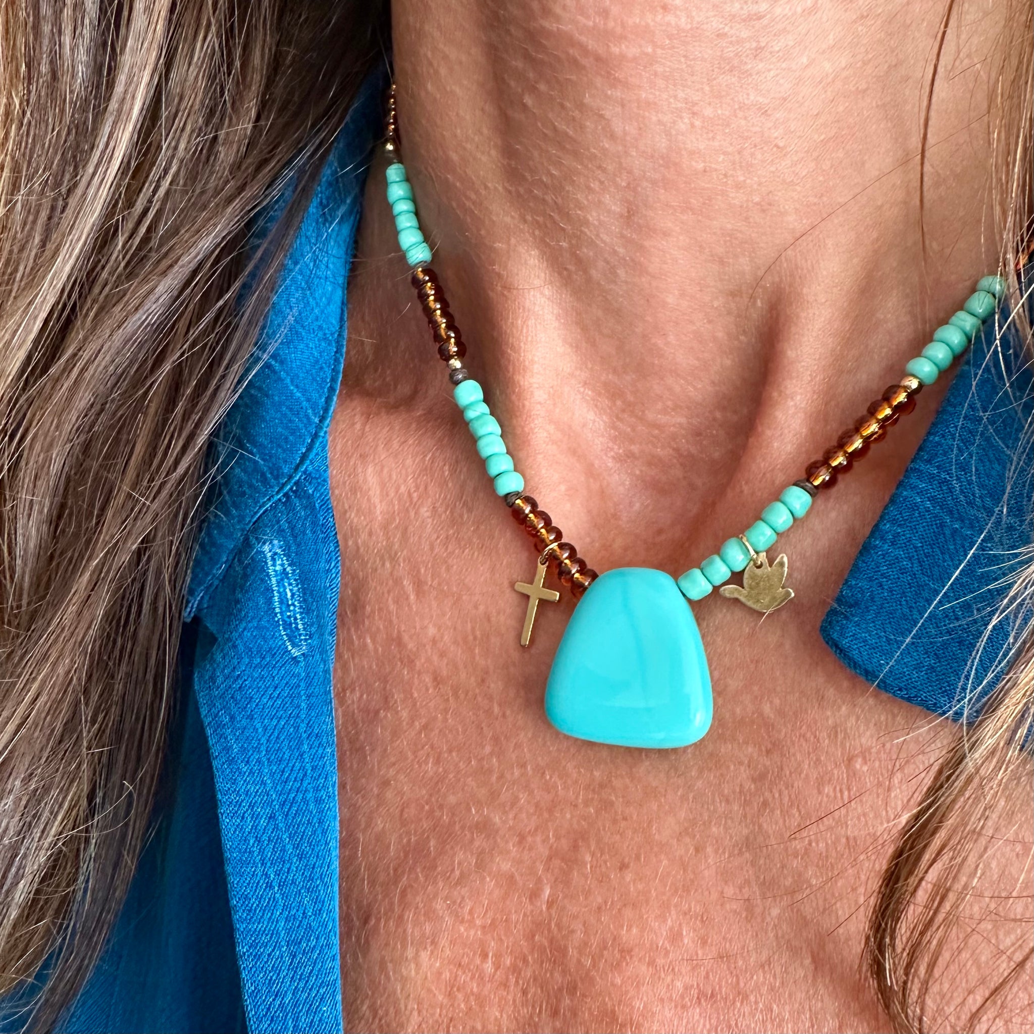 🩵 Colgante "Carolina", cordón de algodón en marrón con bolitas de resina y le cuelga una cruz y una palomita en acero con baño de oro y una pieza en turquesa de cristal.