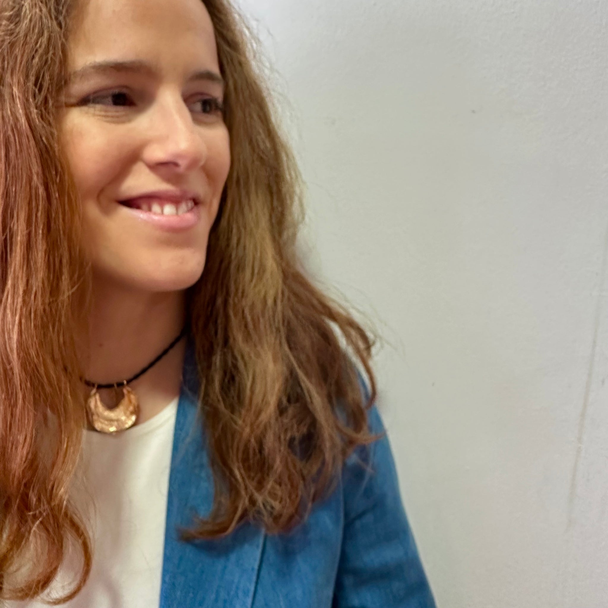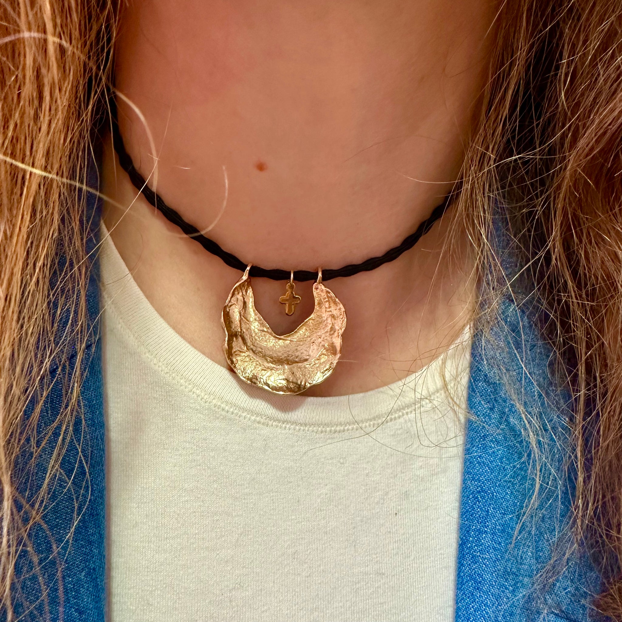 Colgante “Coco”, cinta elástica de color y le cuelga un adorno de latón dorado y en medio una cruz.