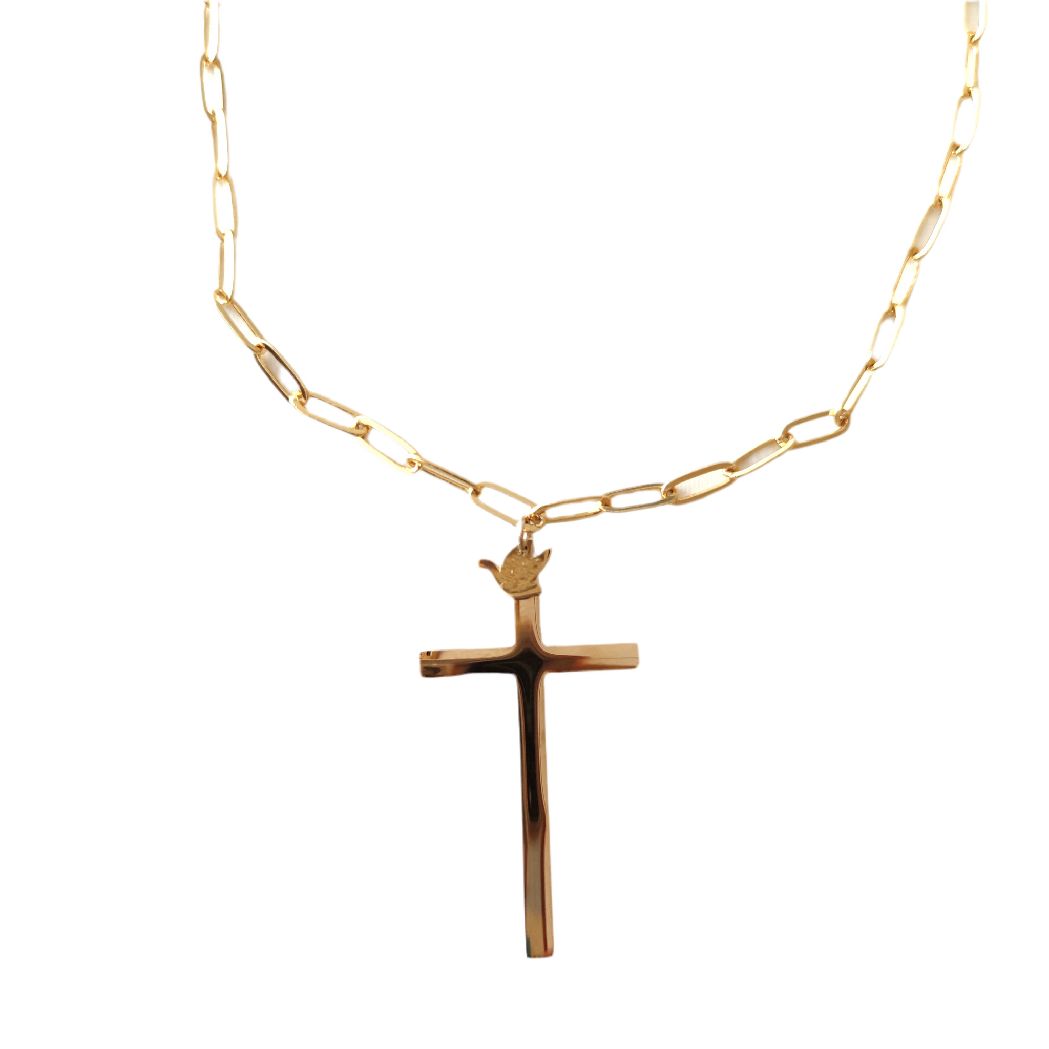 La cruz mide 5 x 3 cm. El largo de la cadena es de 40cm, pudiéndola poner mas corta.