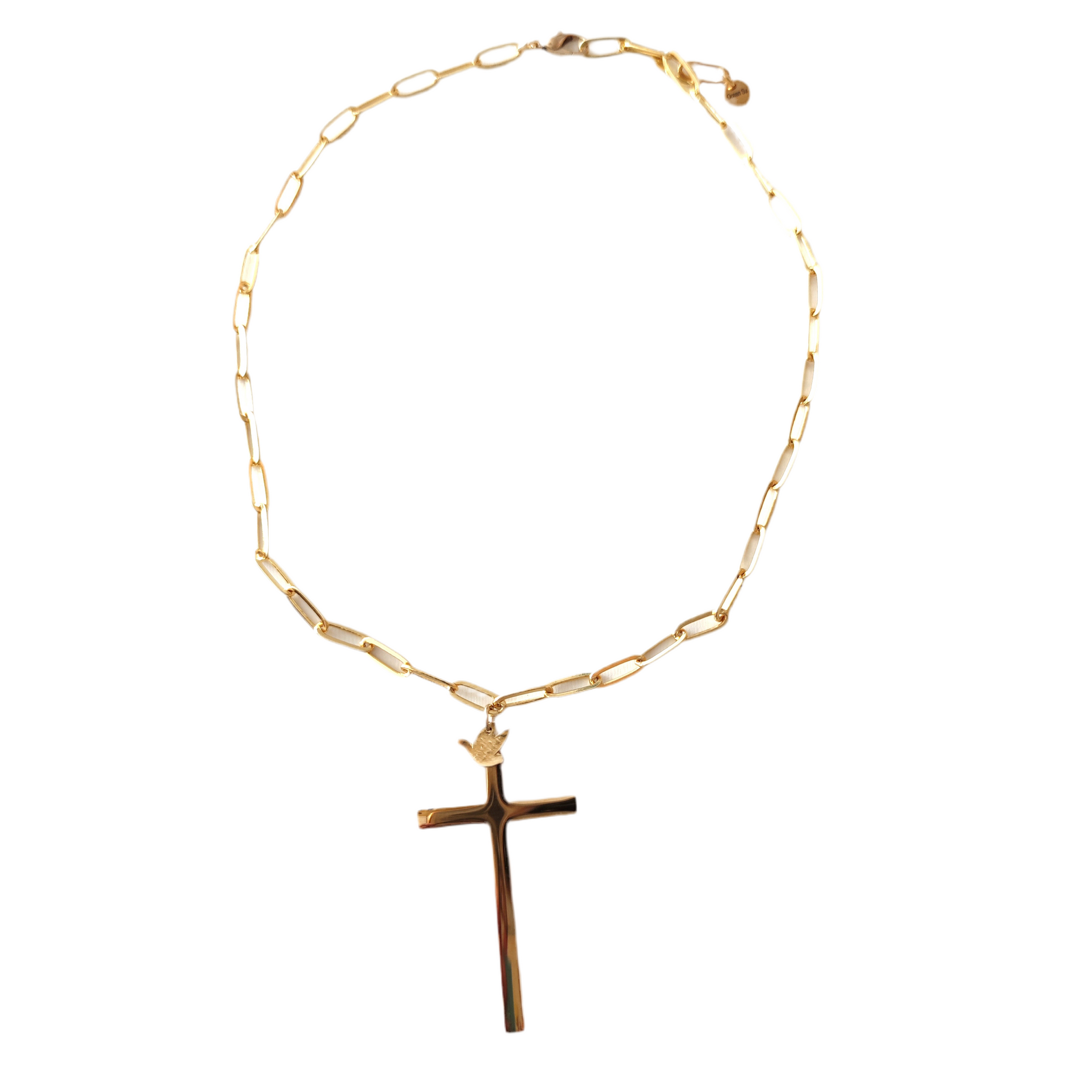 🩵 Colgante "Afeni", cadena de eslabones rectangulares formada, le cuelga una cruz de acero con baño de oro.