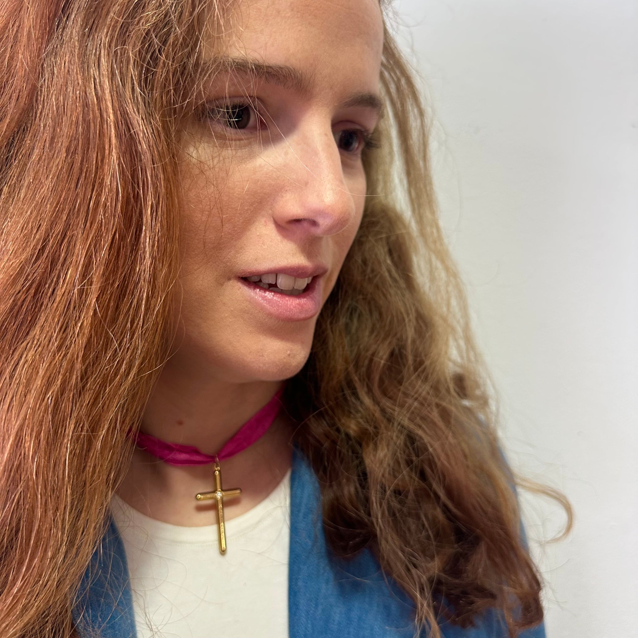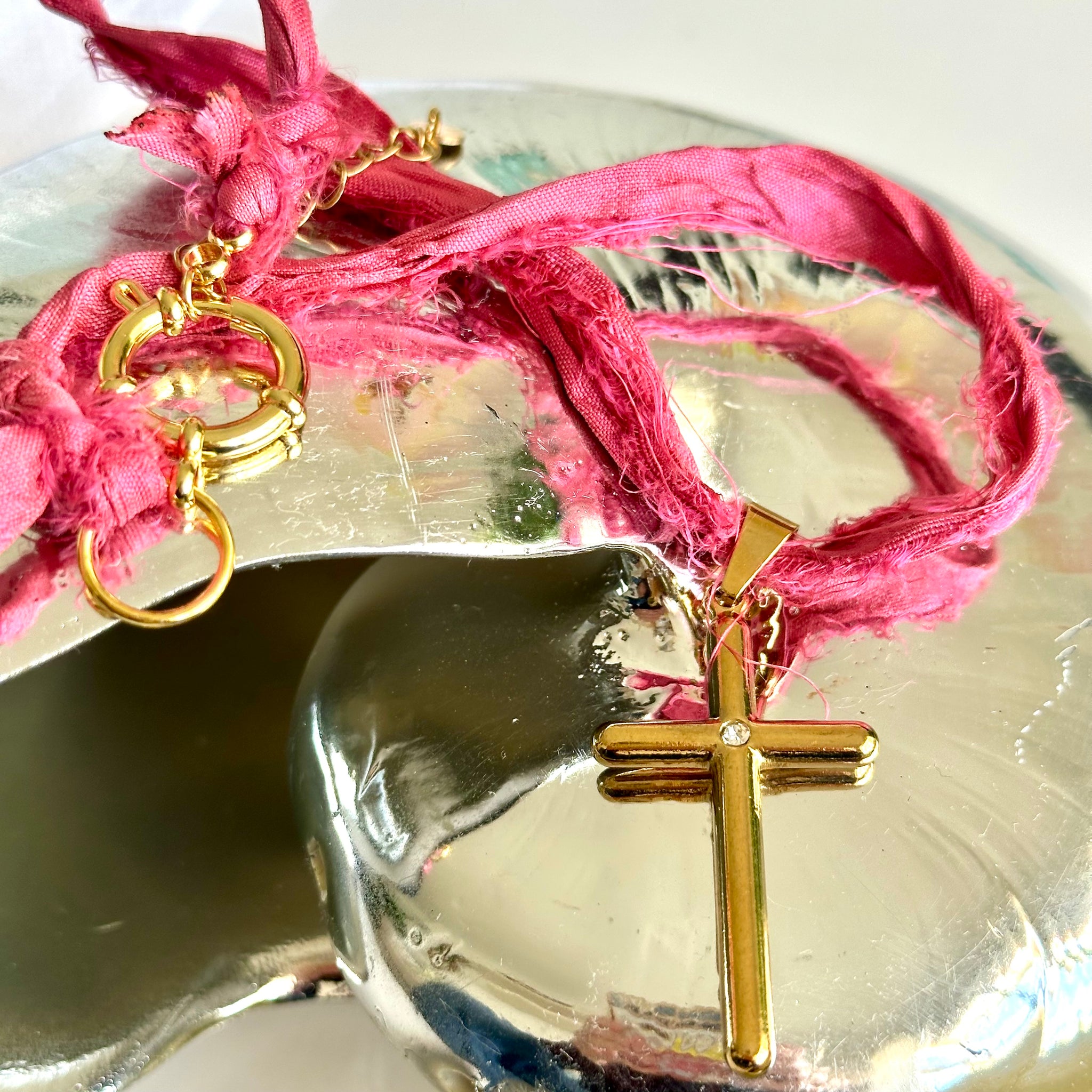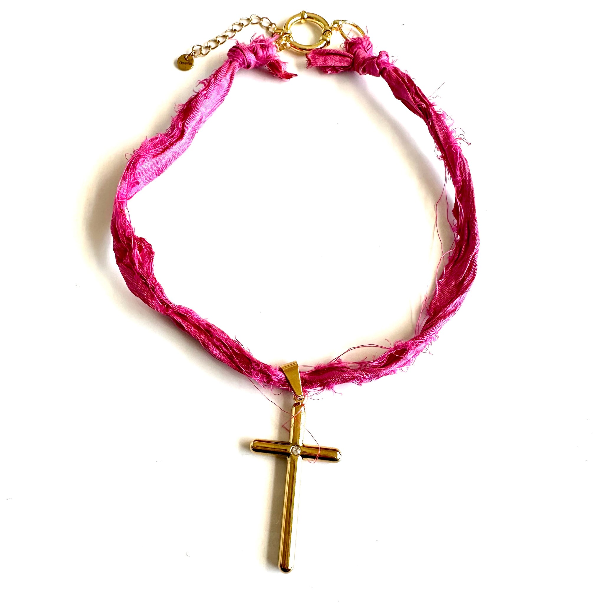 Colgante “Rebeca”, cinta de seda reciclada de color y le cuelga una cruz gruesa con un brillante en medio.