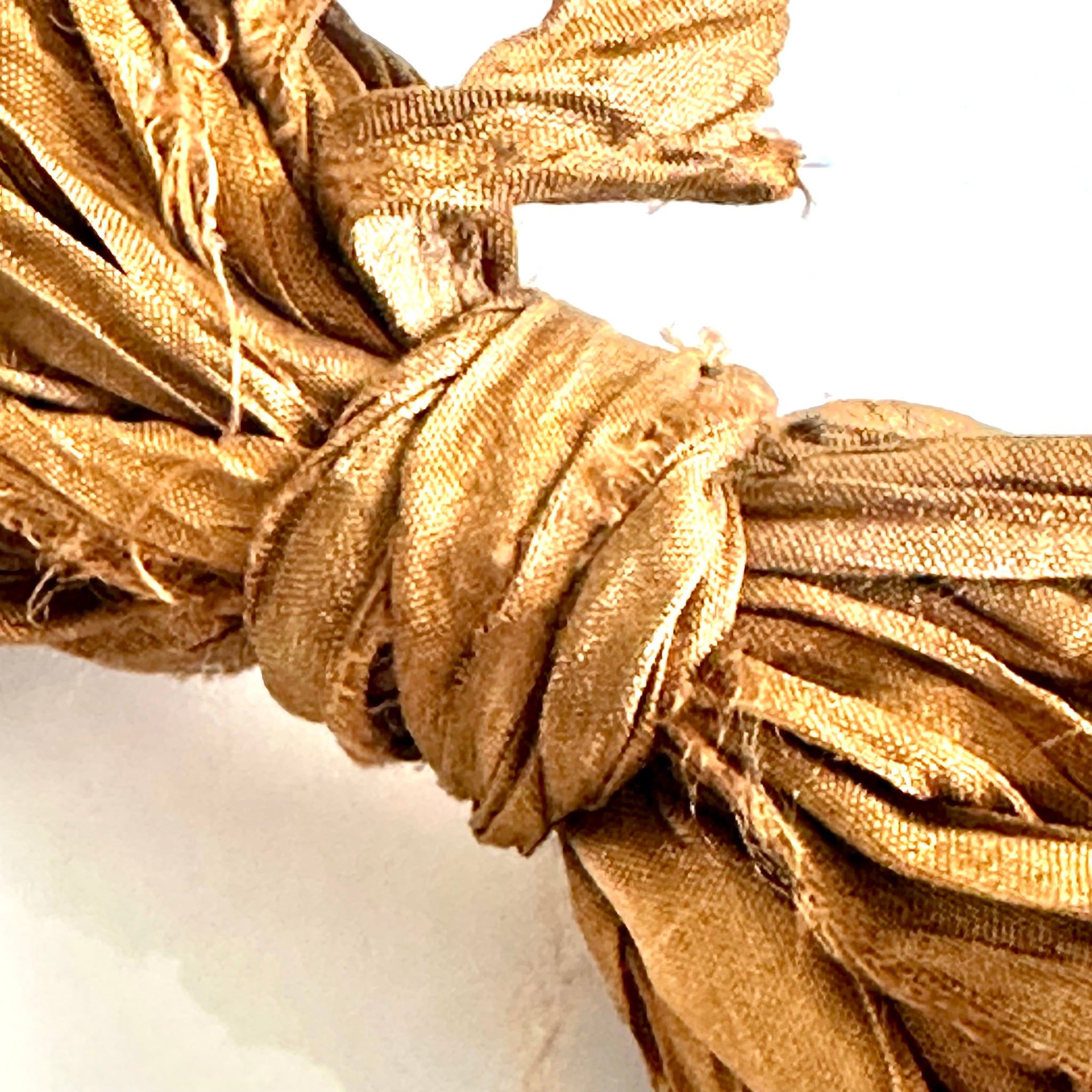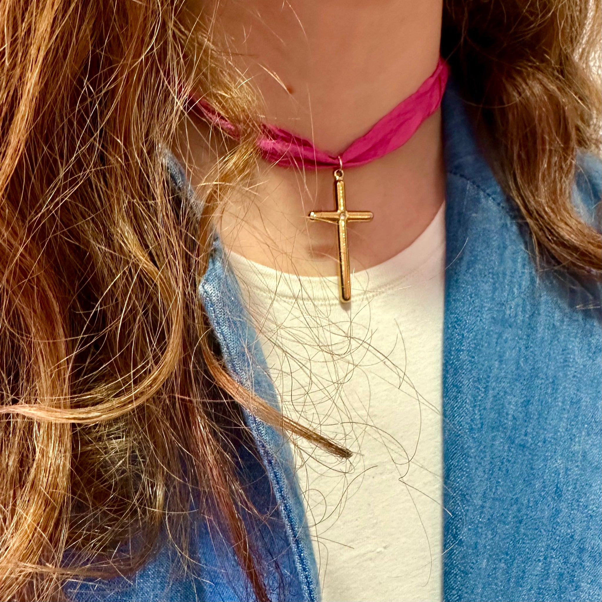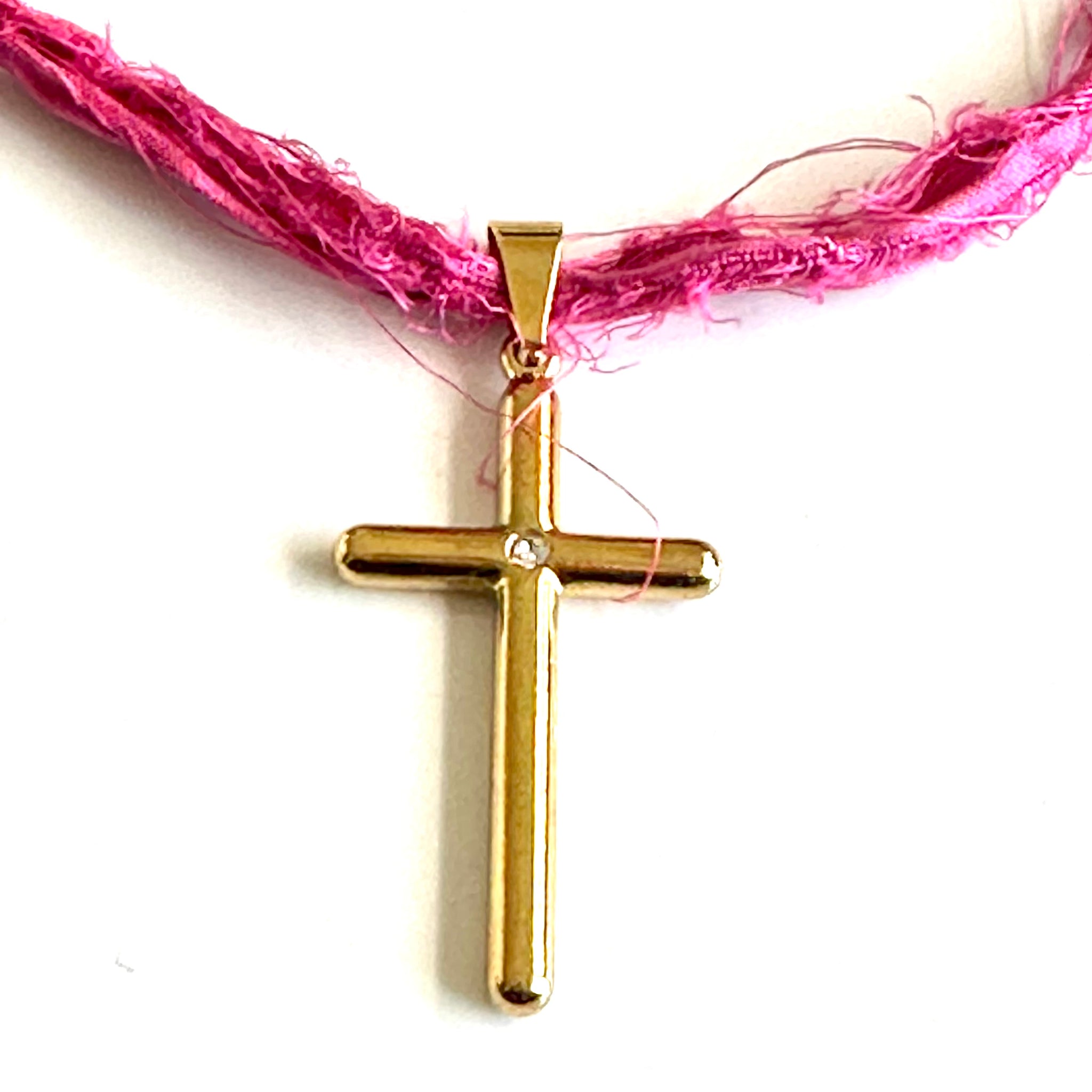 Colgante “Rebeca”, cinta de seda reciclada de color y le cuelga una cruz gruesa con un brillante en medio.