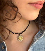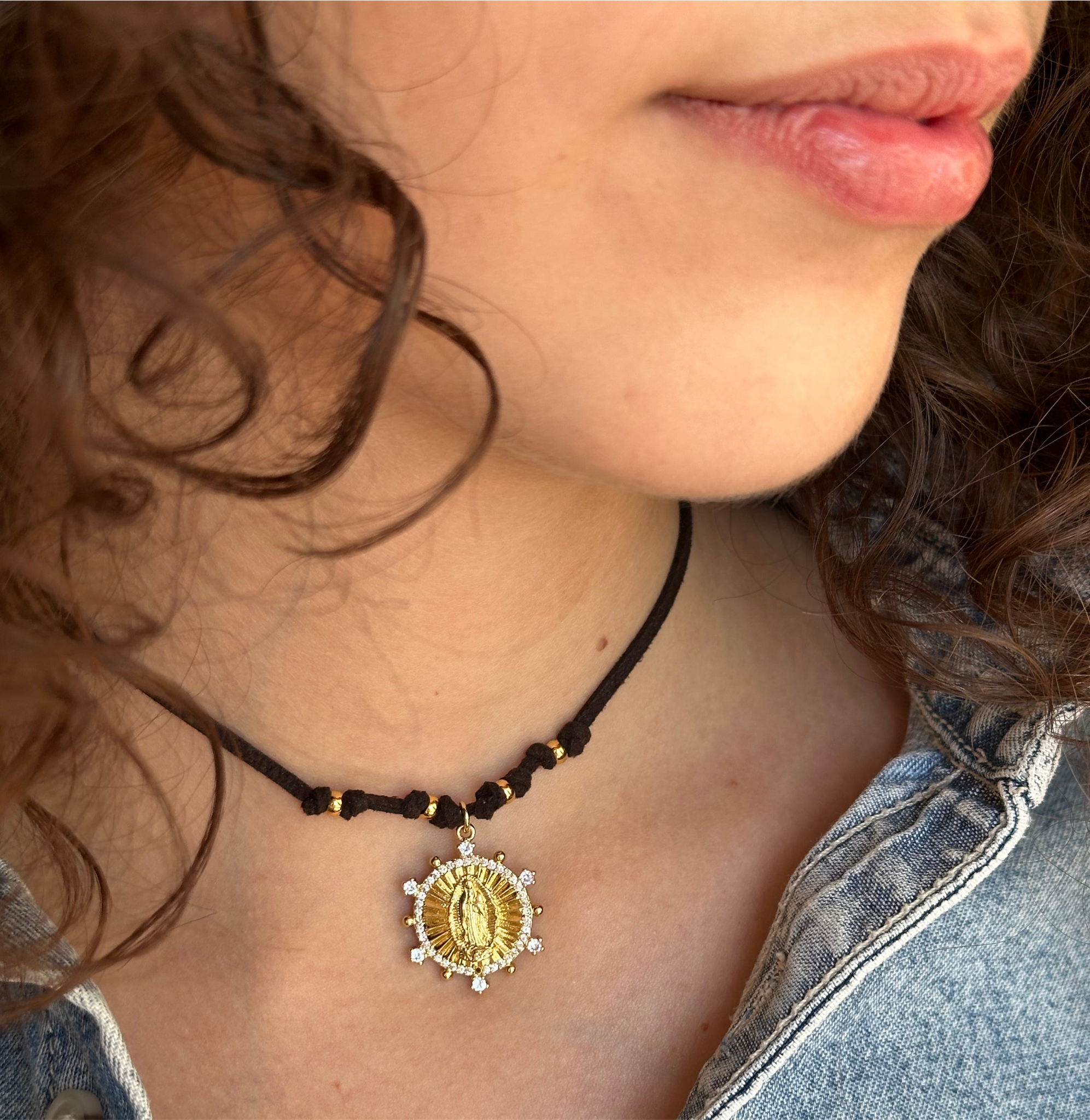🩵 Colgante “ Canela” cinta de ante color marrón y le cuelga una medalla con la imagen en relieve de La Virgen de Guadalupe y alrededor del círculo le salen pequeños brillantes. Es de acero con baño en oro.