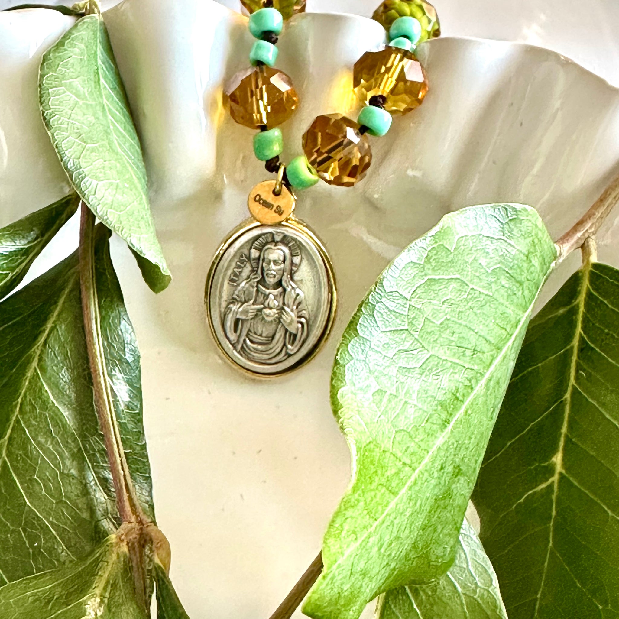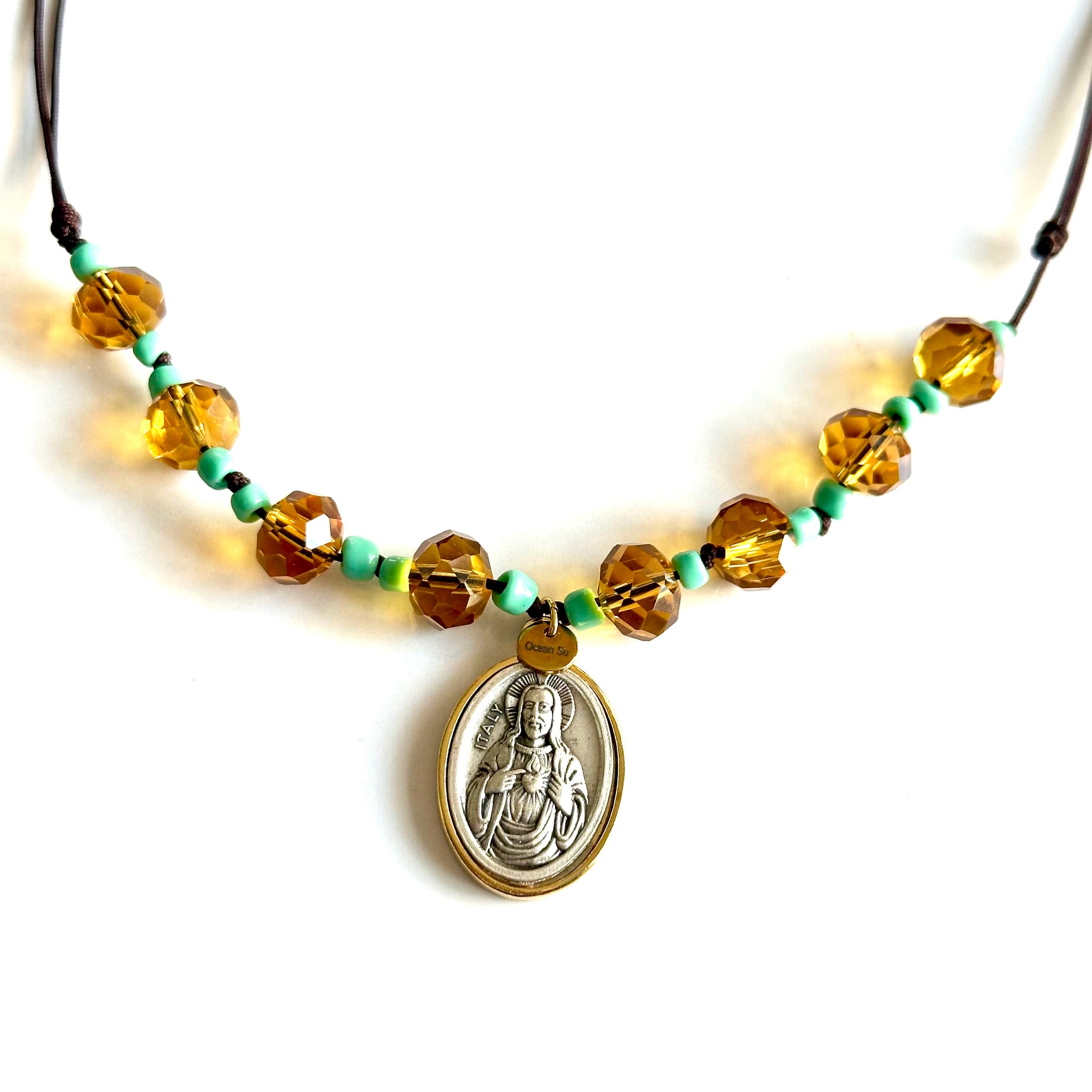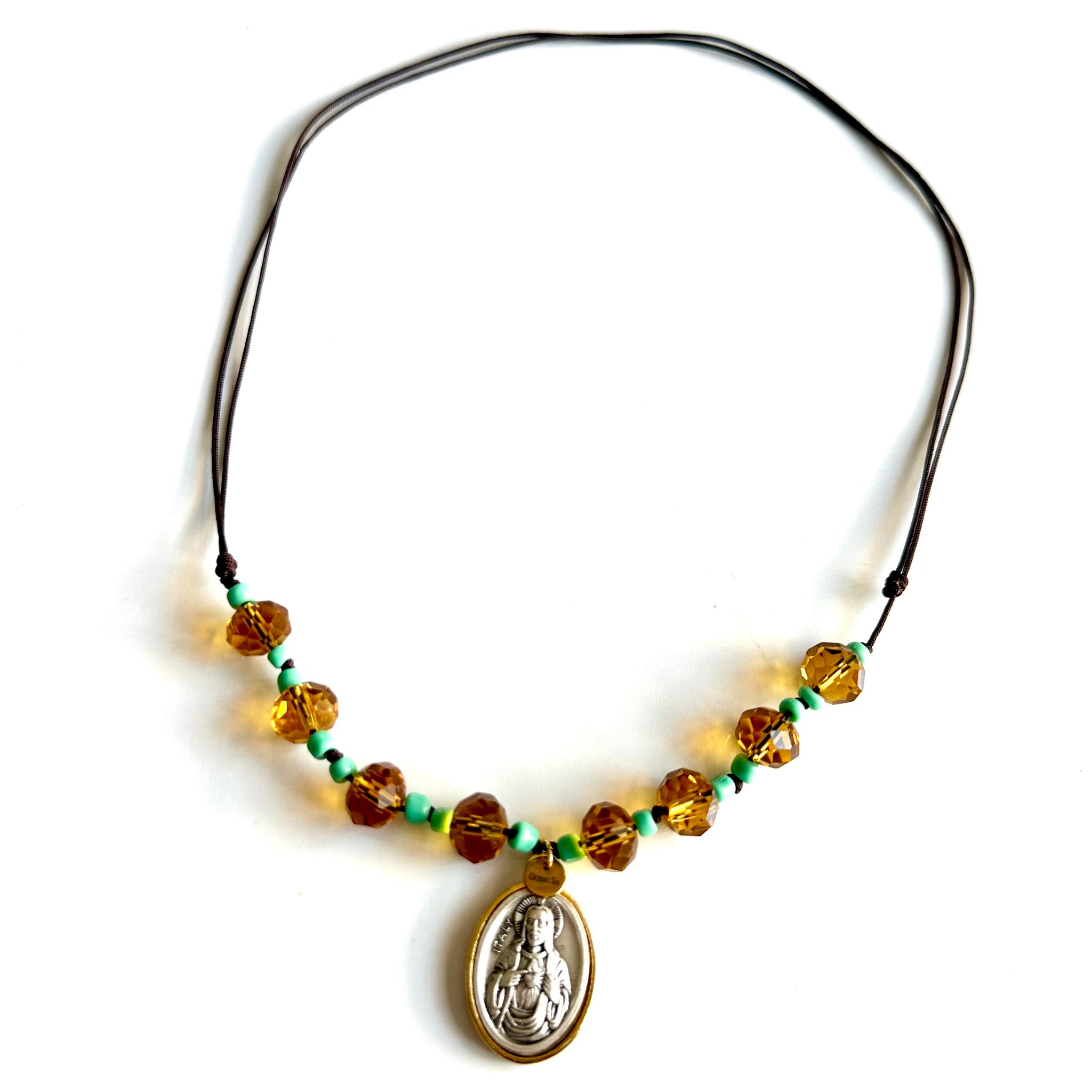 🩵 Colgante “Chuneta”, hilo marrón con bolitas de cristal en color miel y turquesa. Le cuelga una medalla ovalada en color plata y alrededor en dorado con la imagen en relieve del Sagrado Corazón.