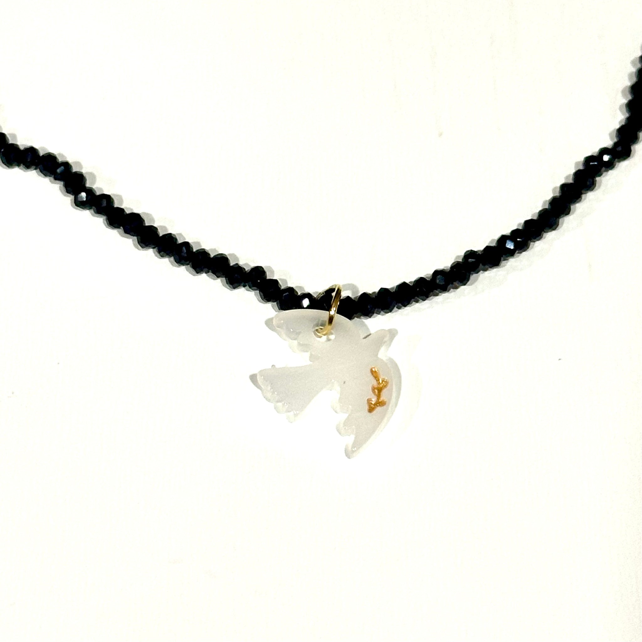 🩵 Colgante "Clau", formado por cristalitos en color azulon azabache y le cuelga una palomita en resina blanca grabado una ramita en dorado y lleva otra palomita hueca en acero con baño en oro.