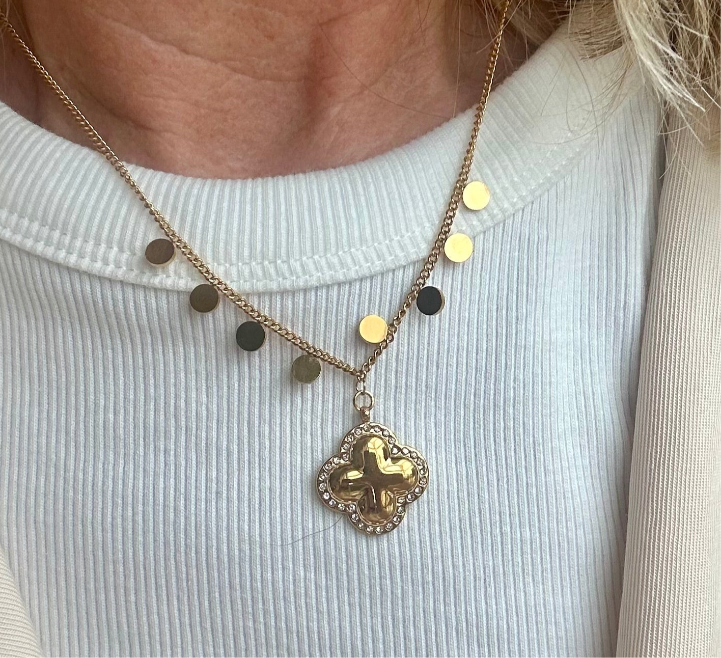 Colgante “Fiorella”, cadena de acero de oro, le cuelgan unos círculos y en el medio lleva una original cruz con forma redonda y alrededor unos brillantitos.