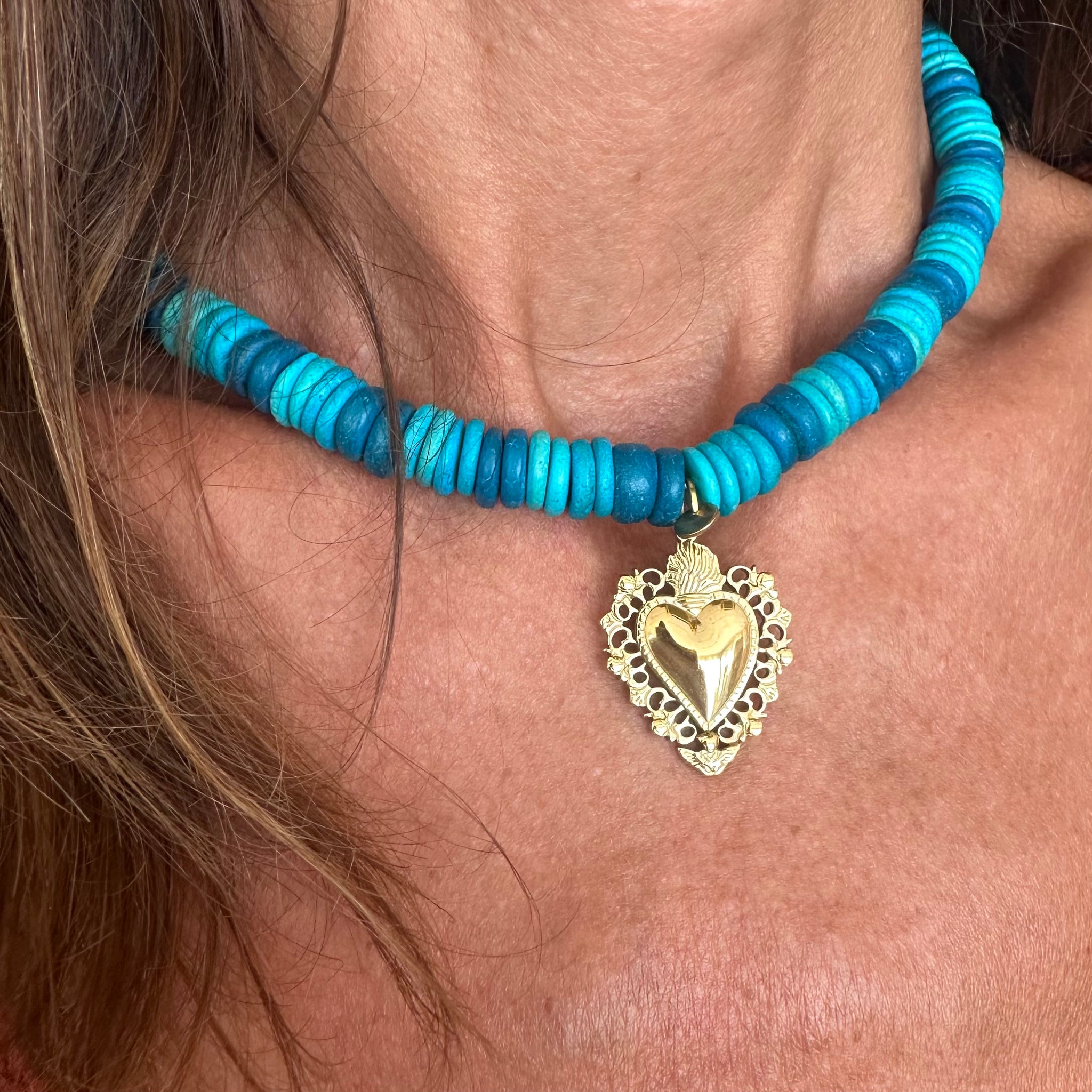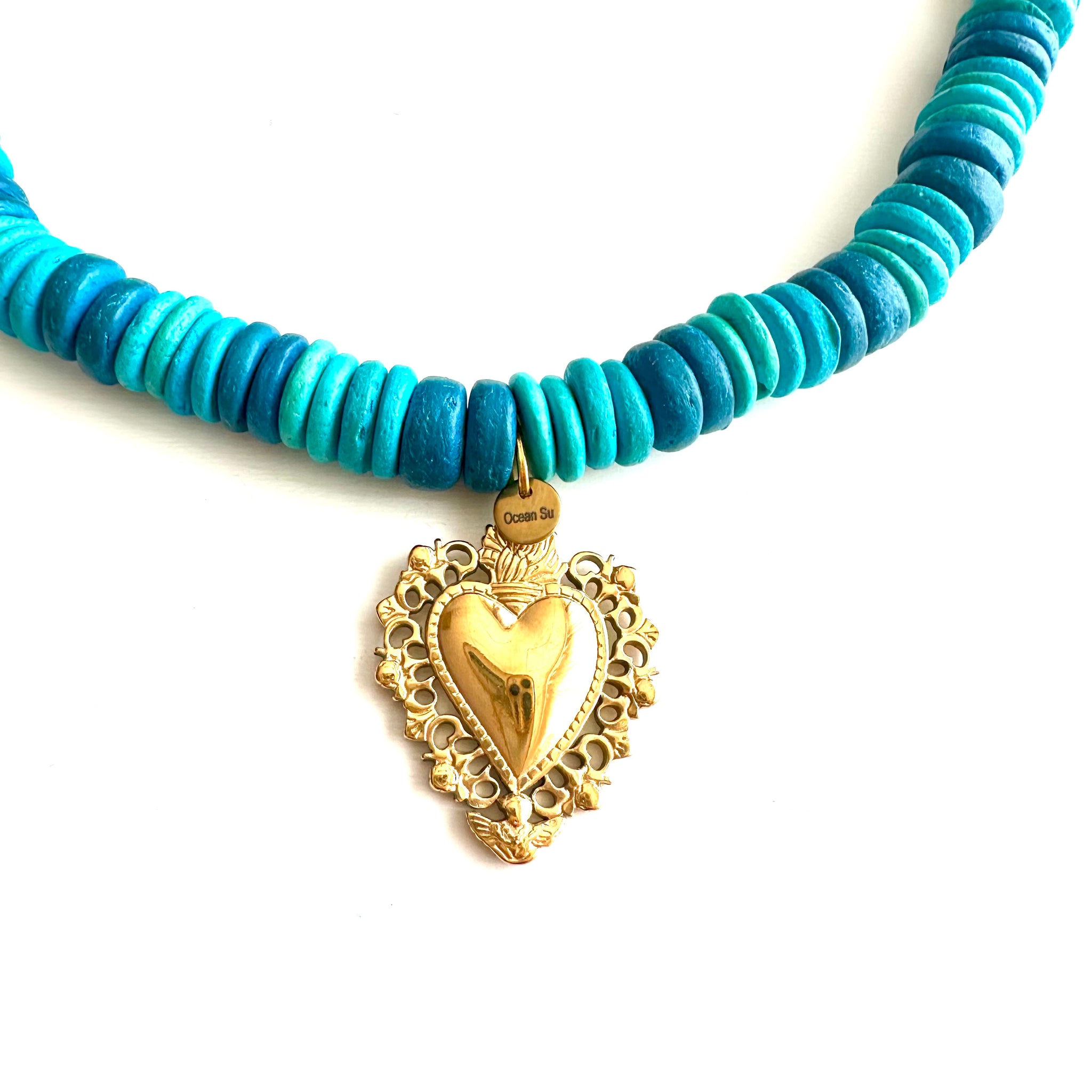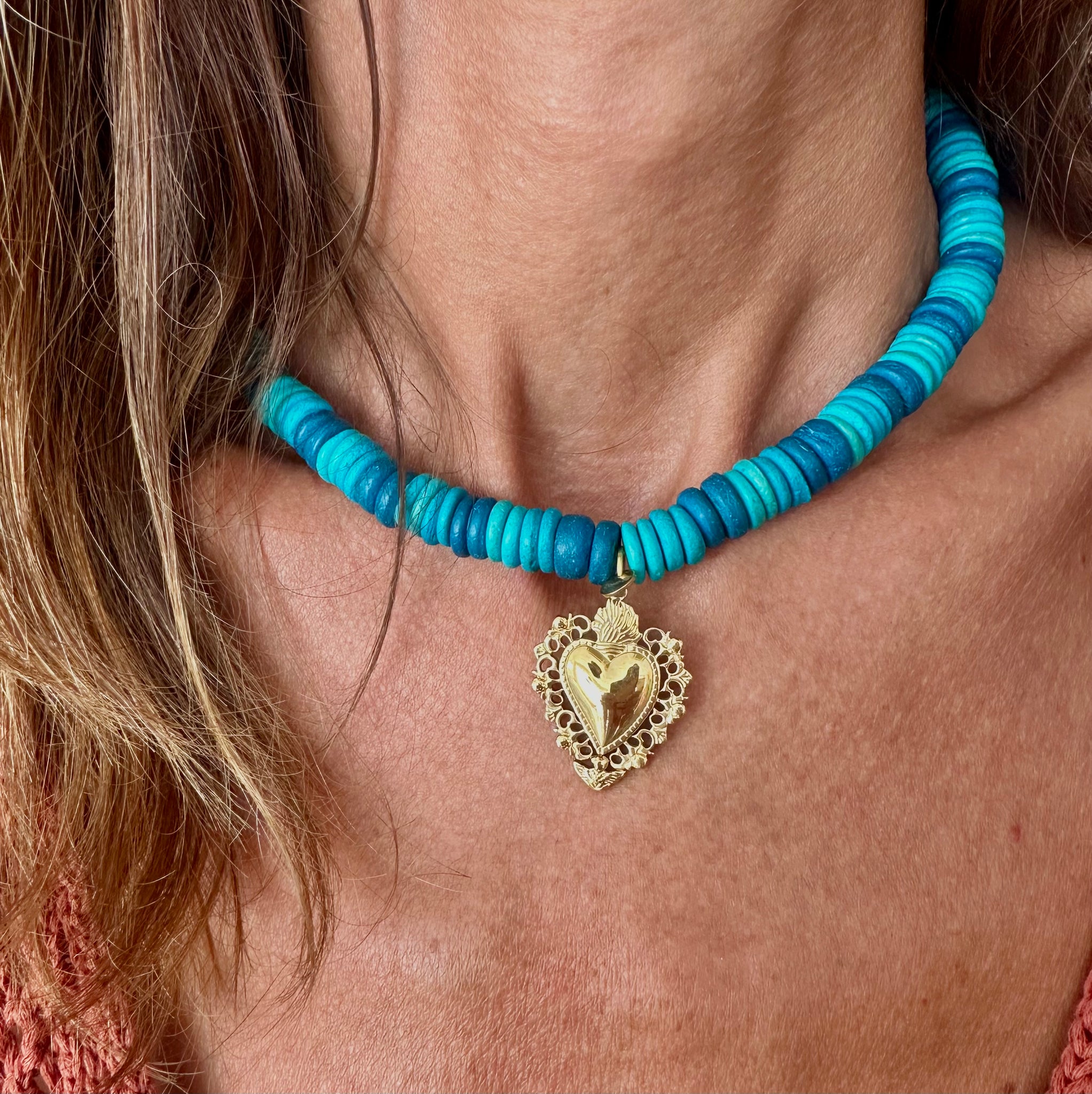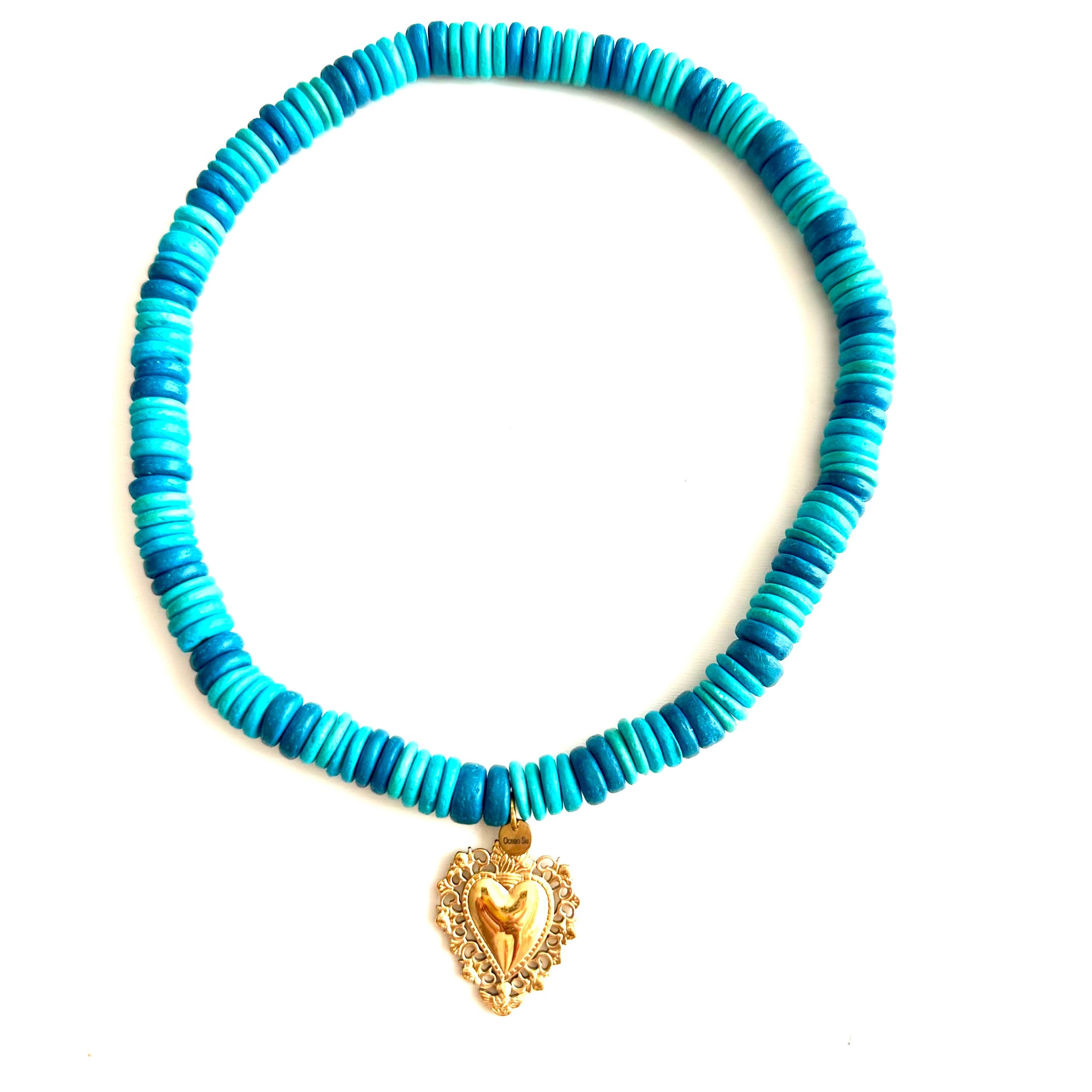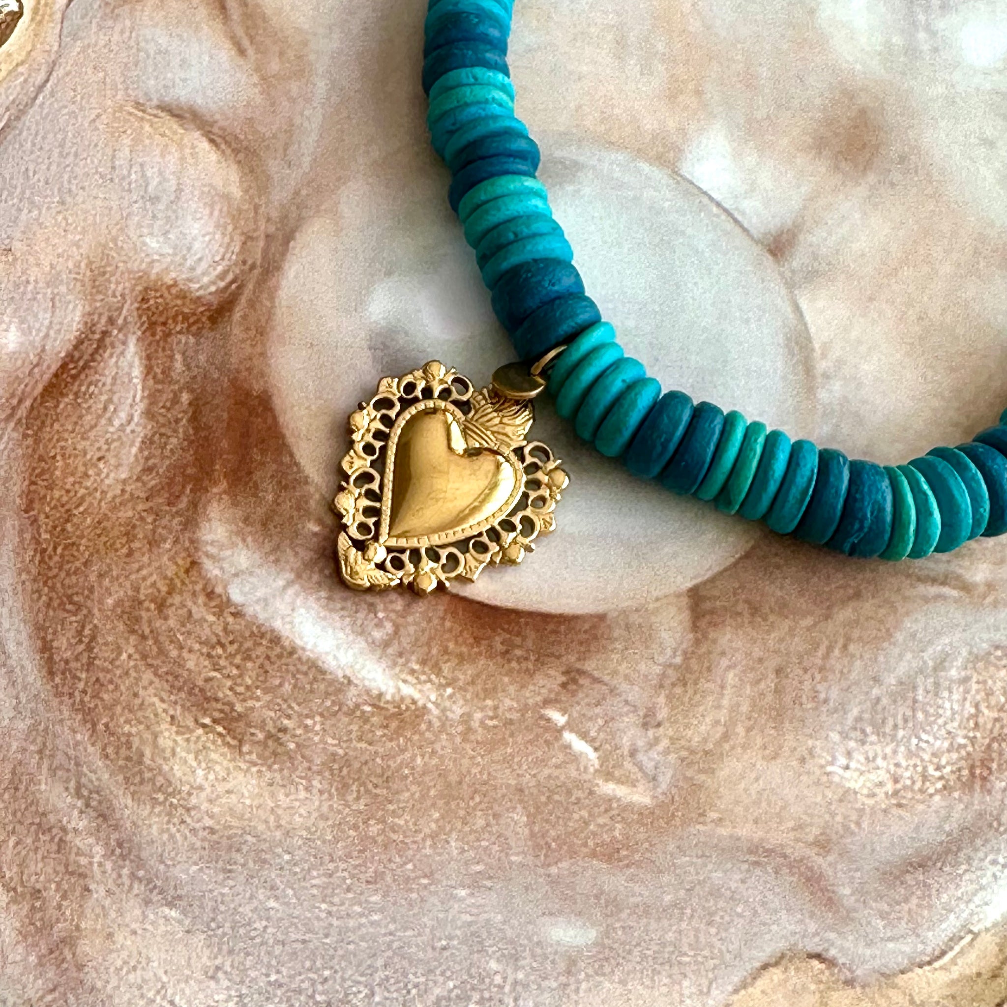 🩵 Collar “Gloria”, goma elástica formada por círculos de madera en turquesa y le cuelga una medalla en forma de Ságrafo Corazón, de acero con baño en oro.