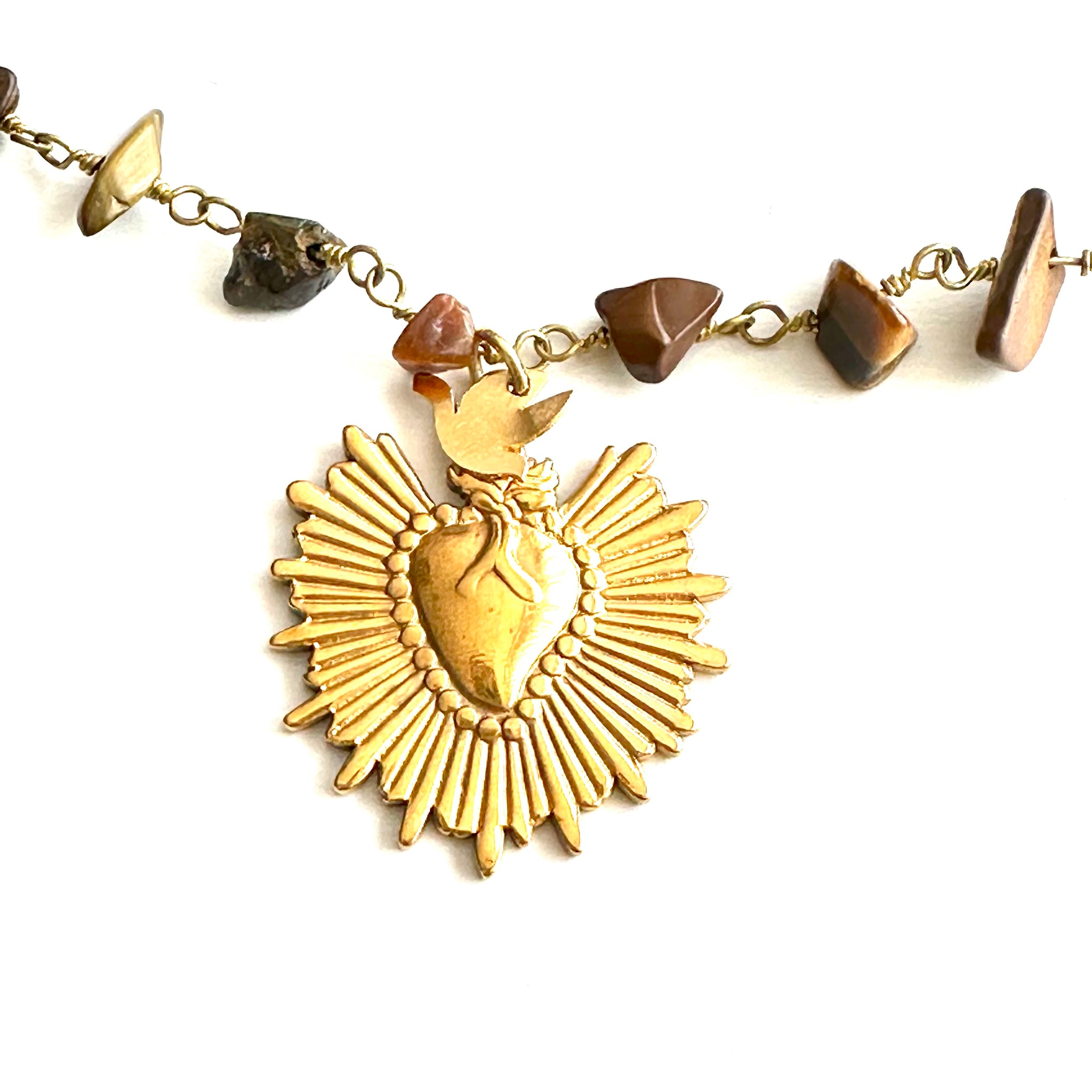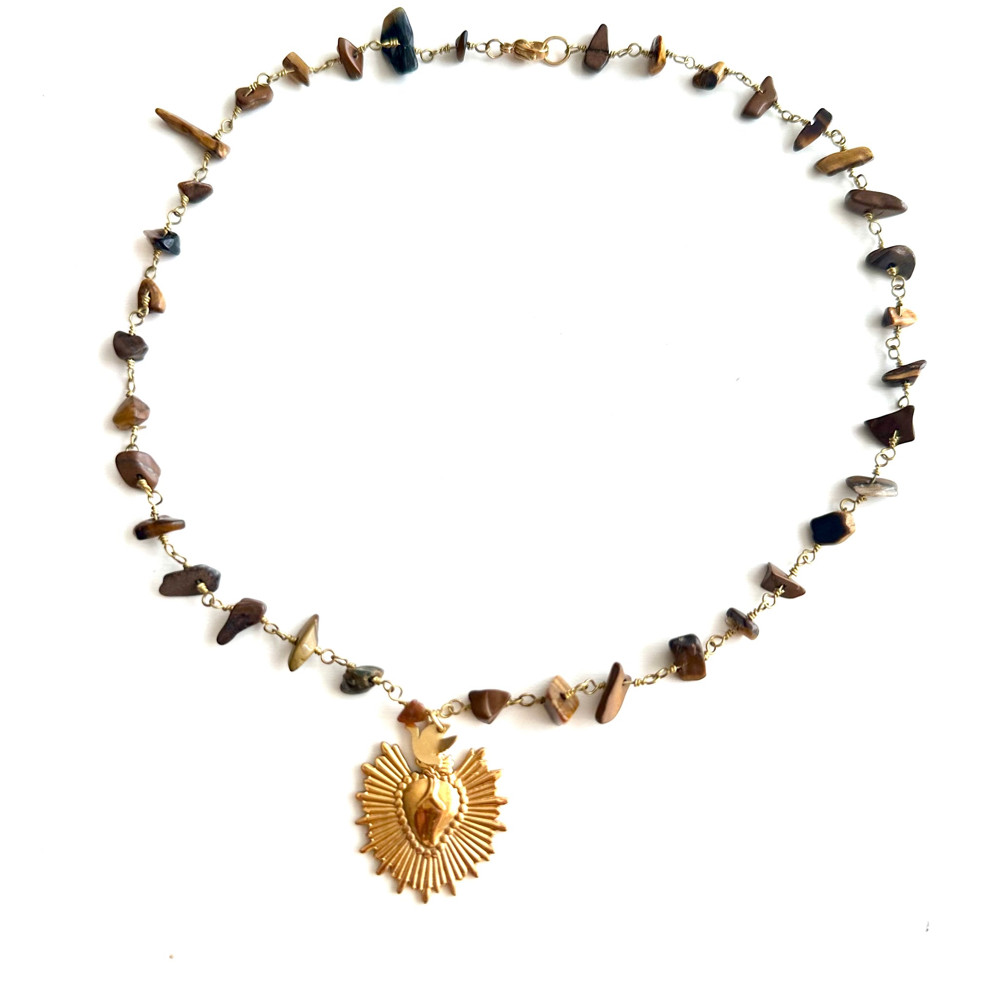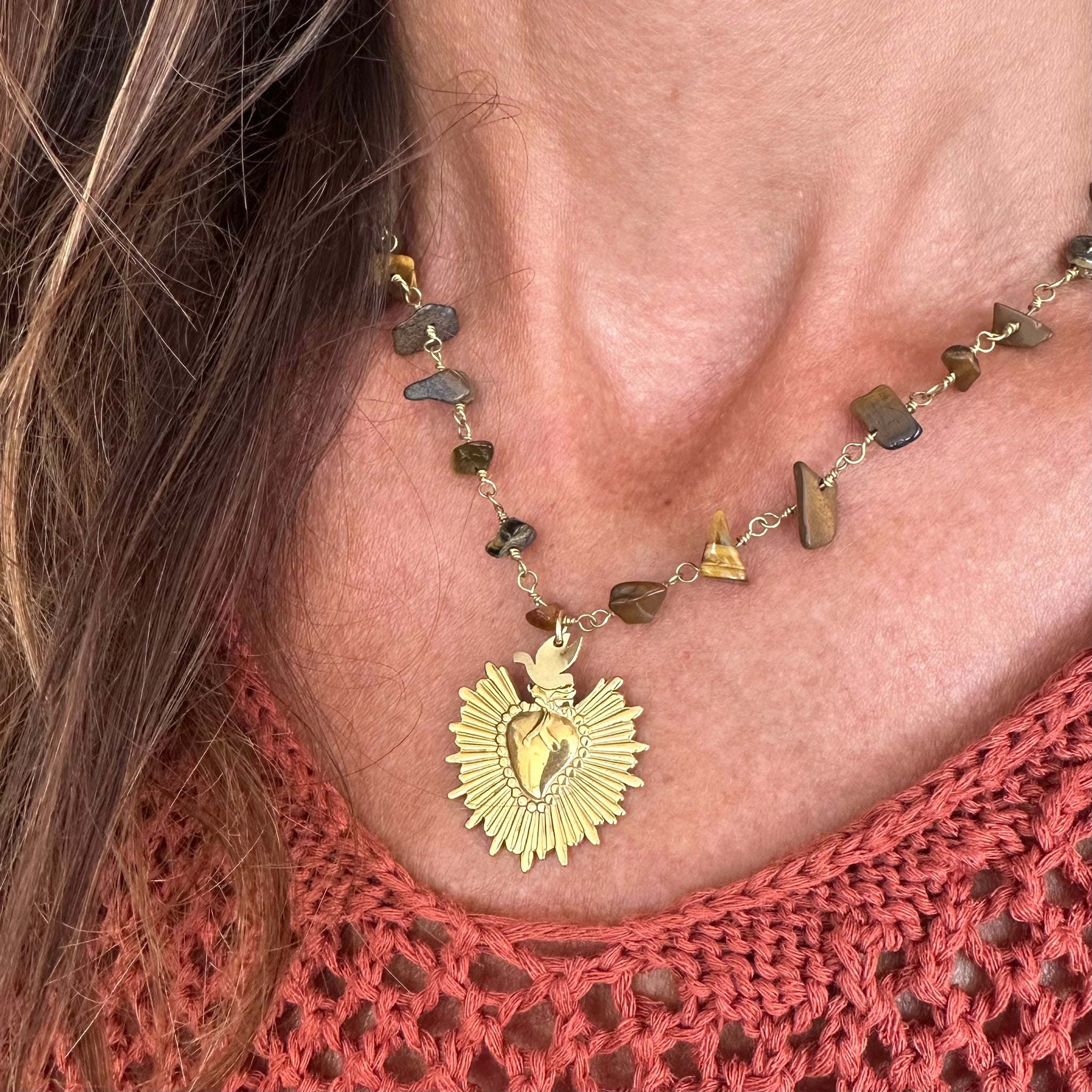 🩵 Colgante “Emily”, formado por piedrecitas naturales en color marrón y le cuelga un corazón de acero con baño en oro.