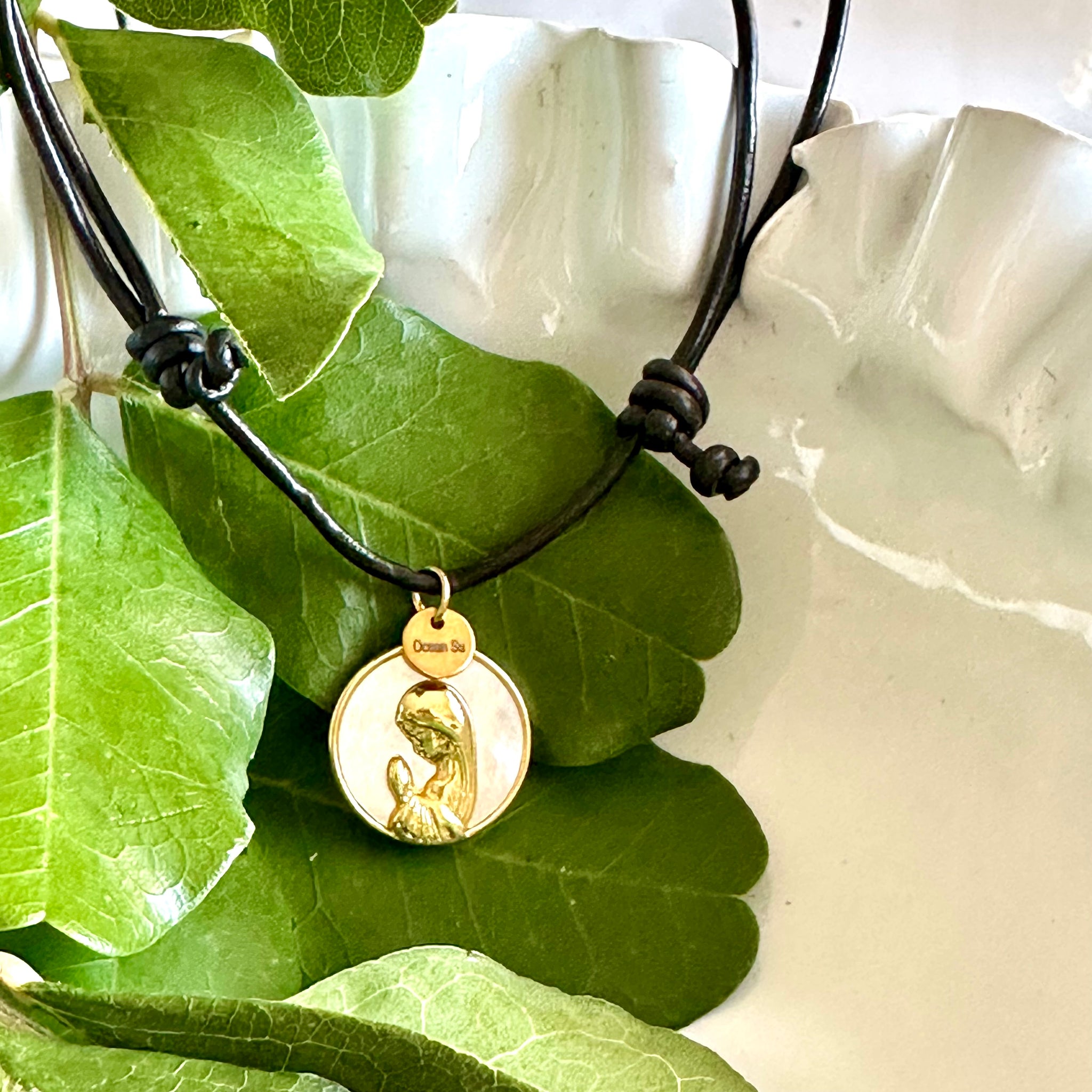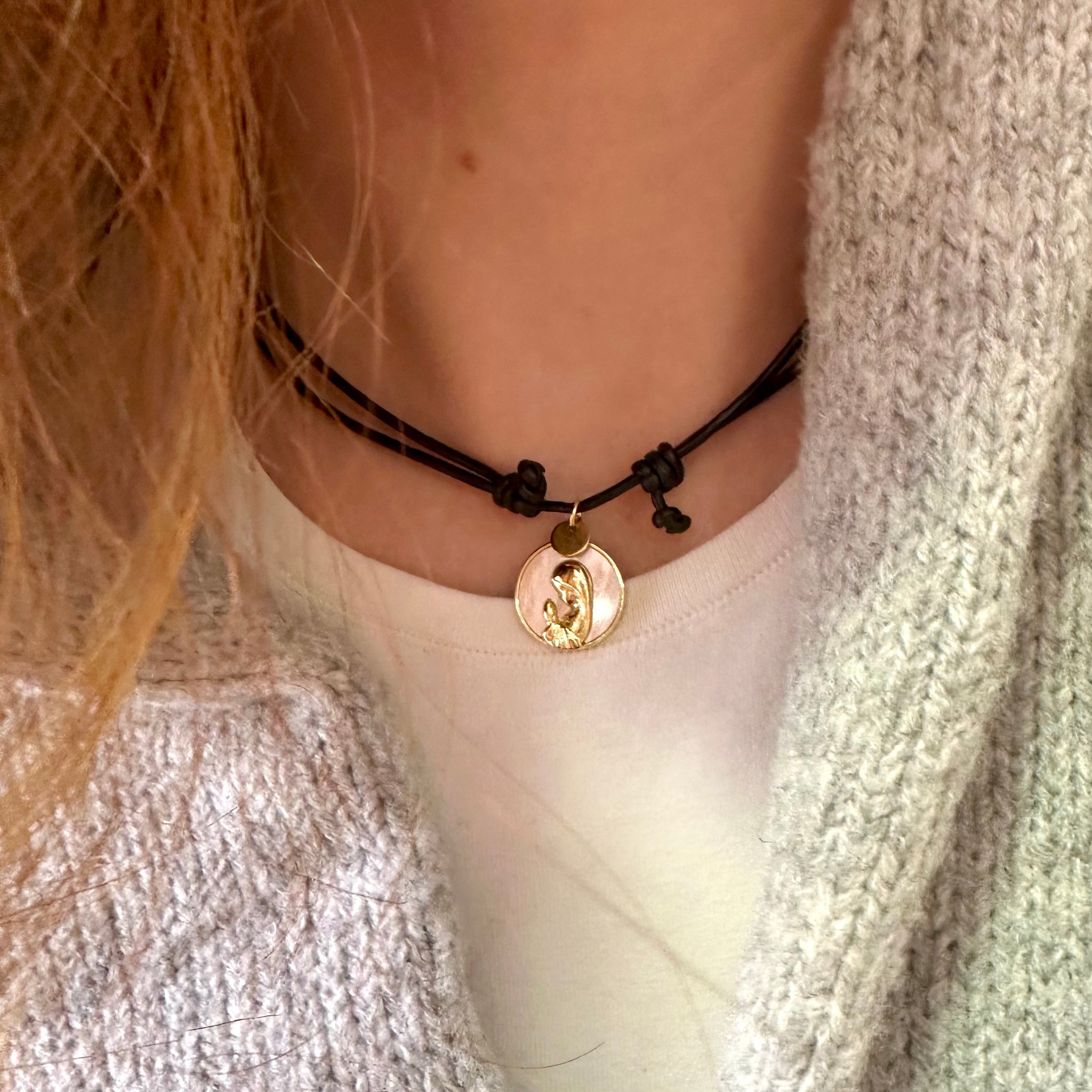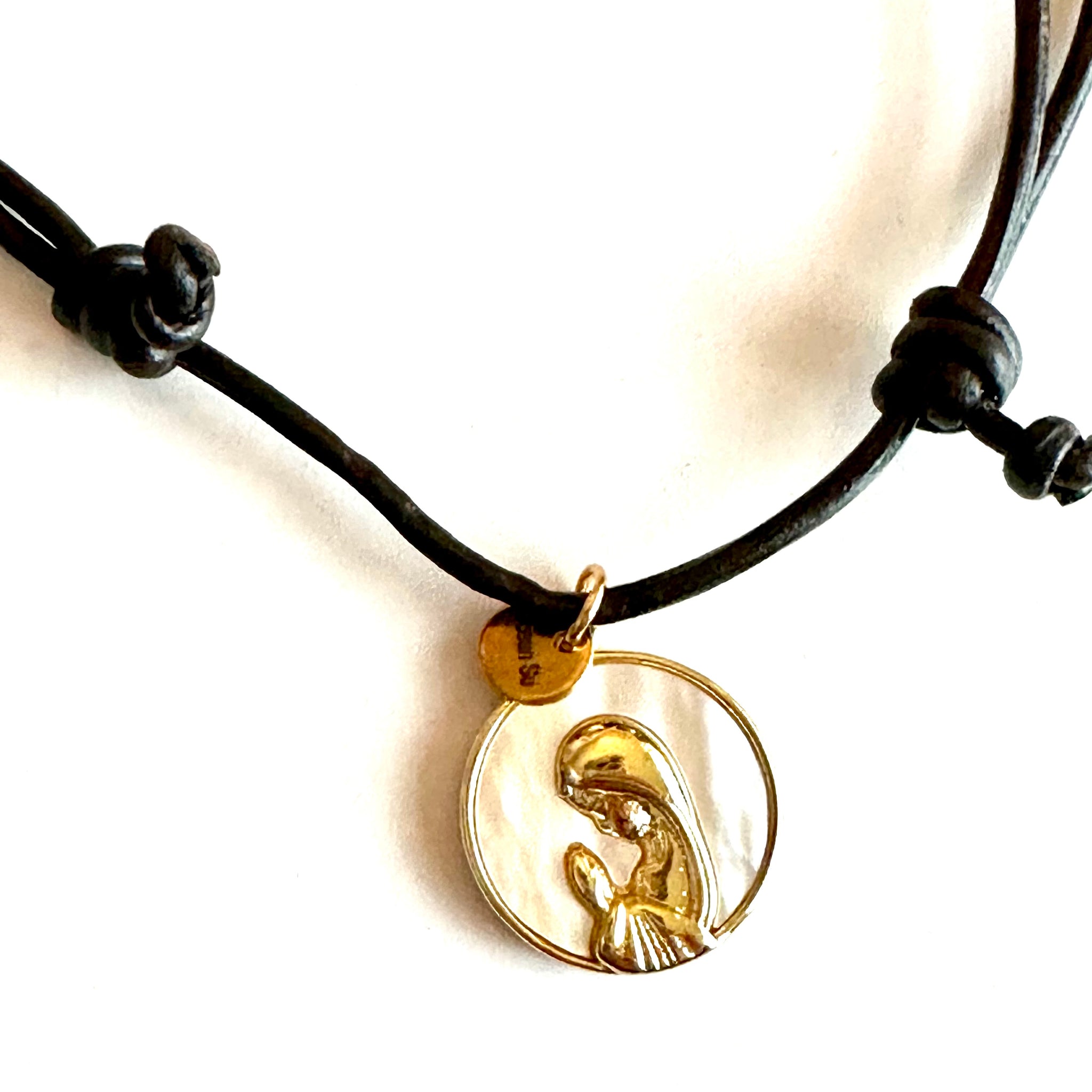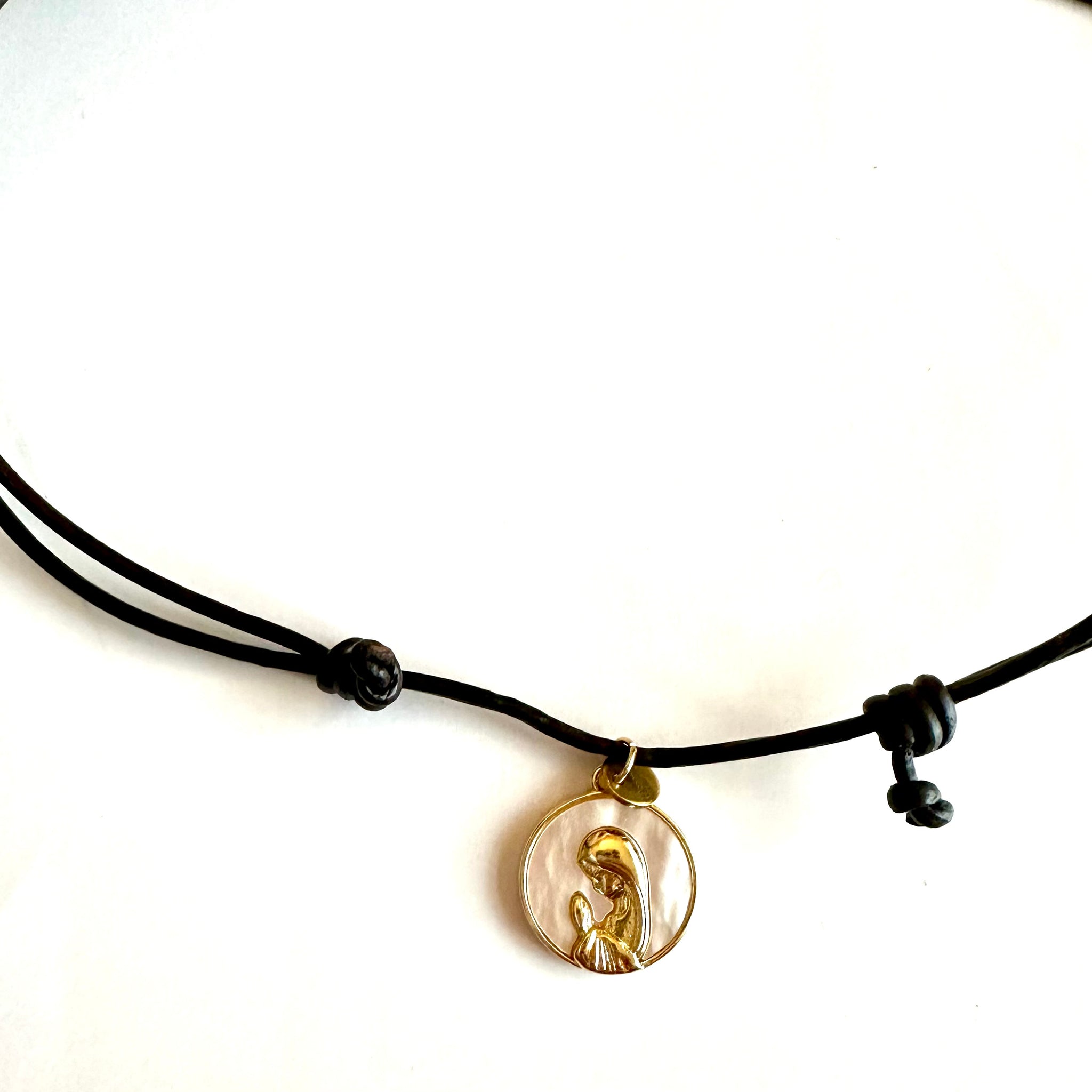 🩵 Colgante “ Amelia”. Cordón de piel, le cuelga una medalla circular de nácar y en relieve la imagen de la Virgen Niña en acero con baño de oro.