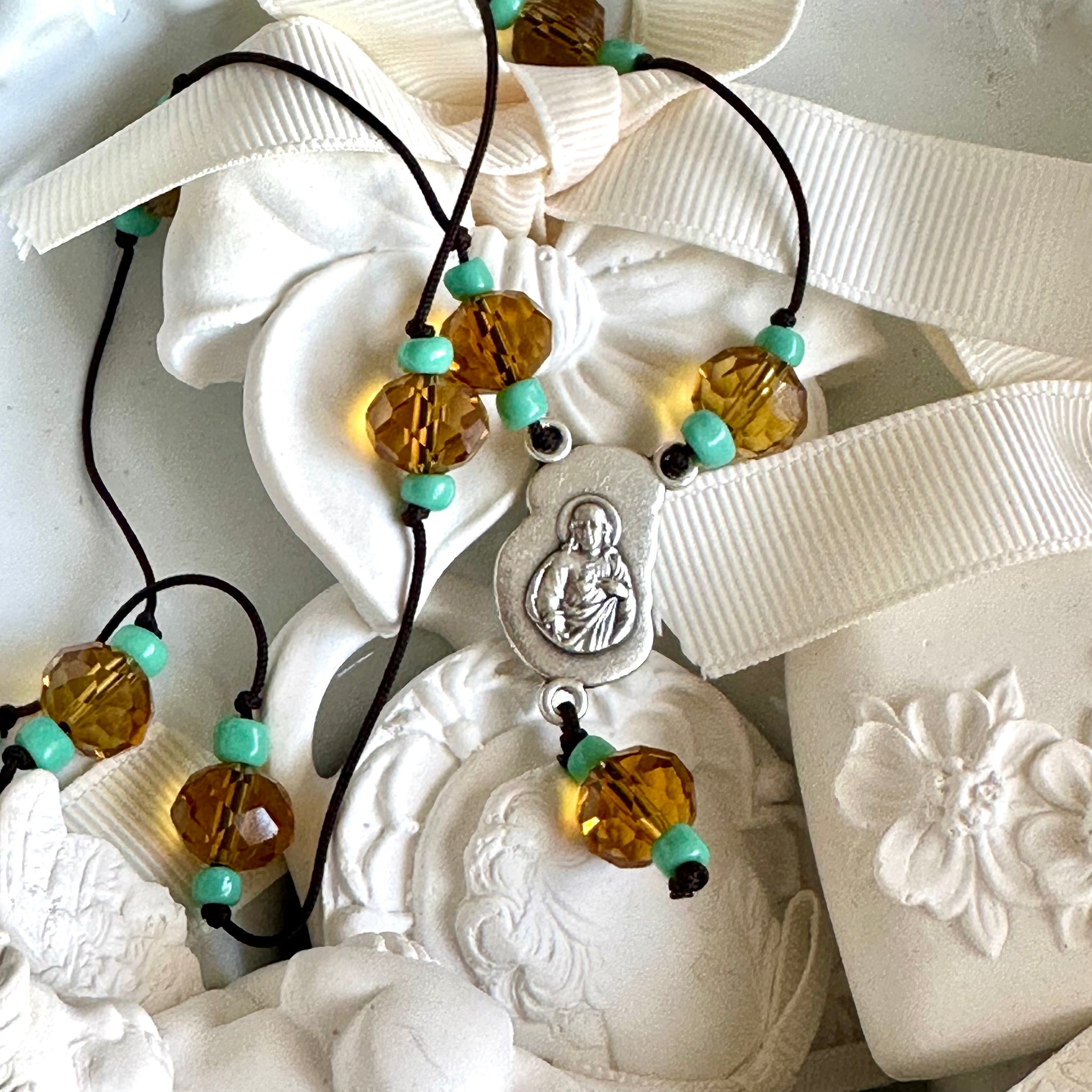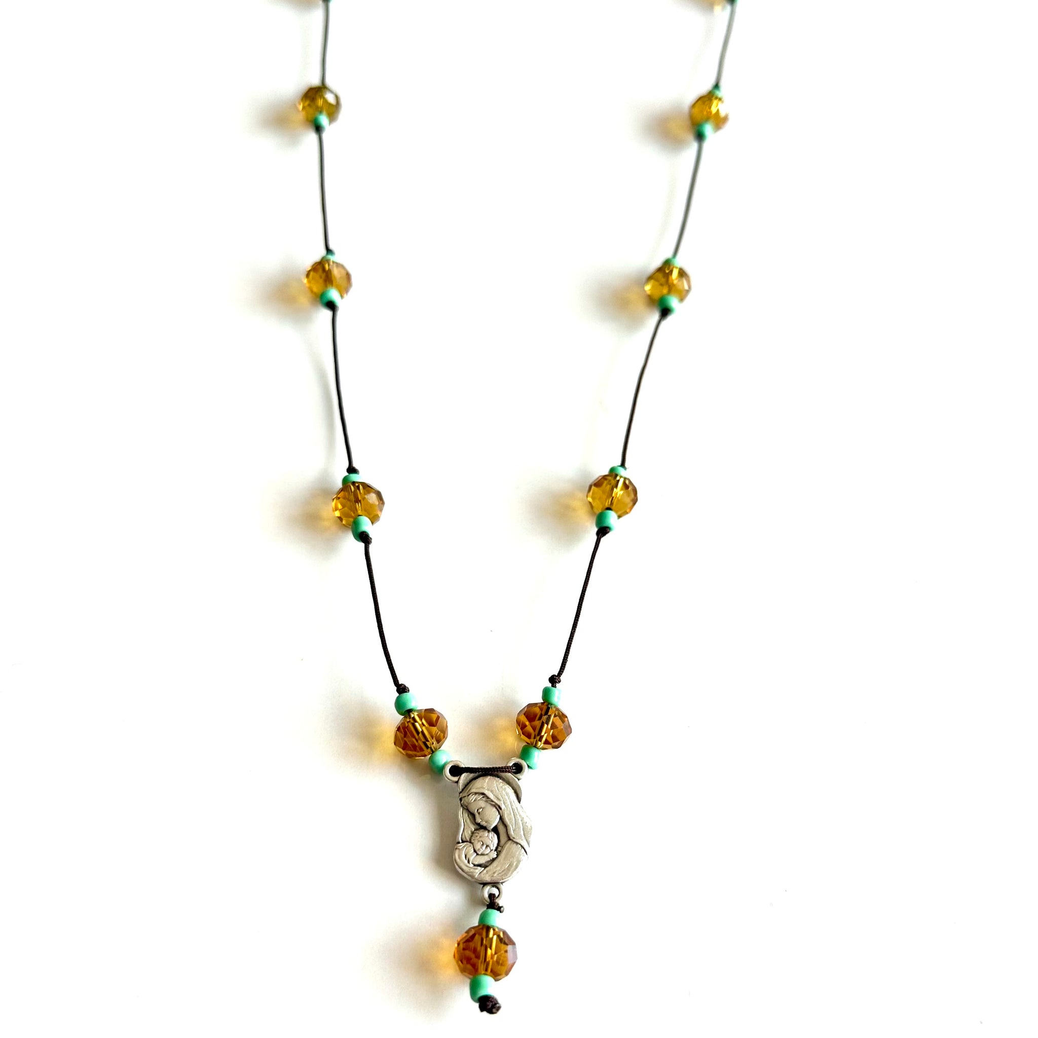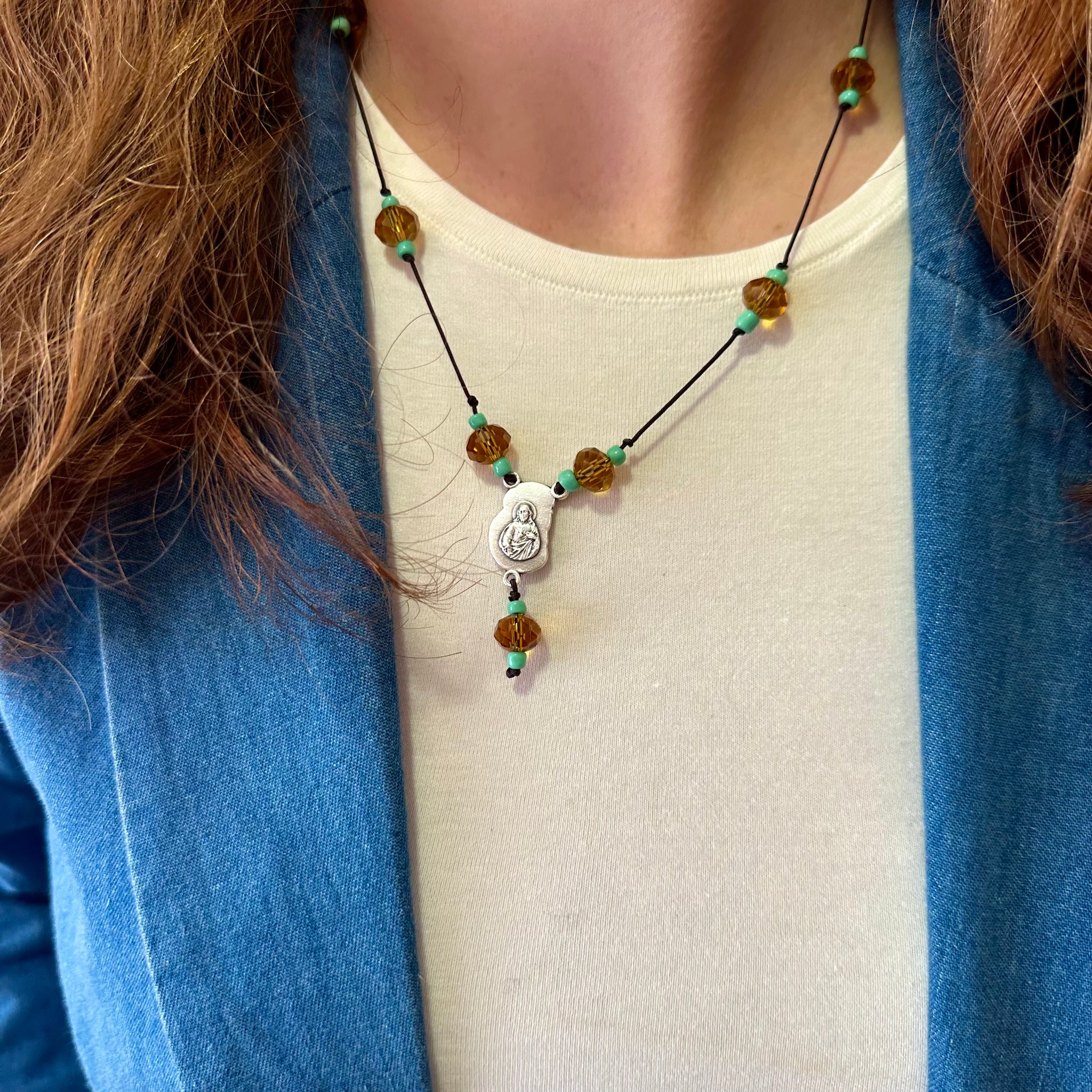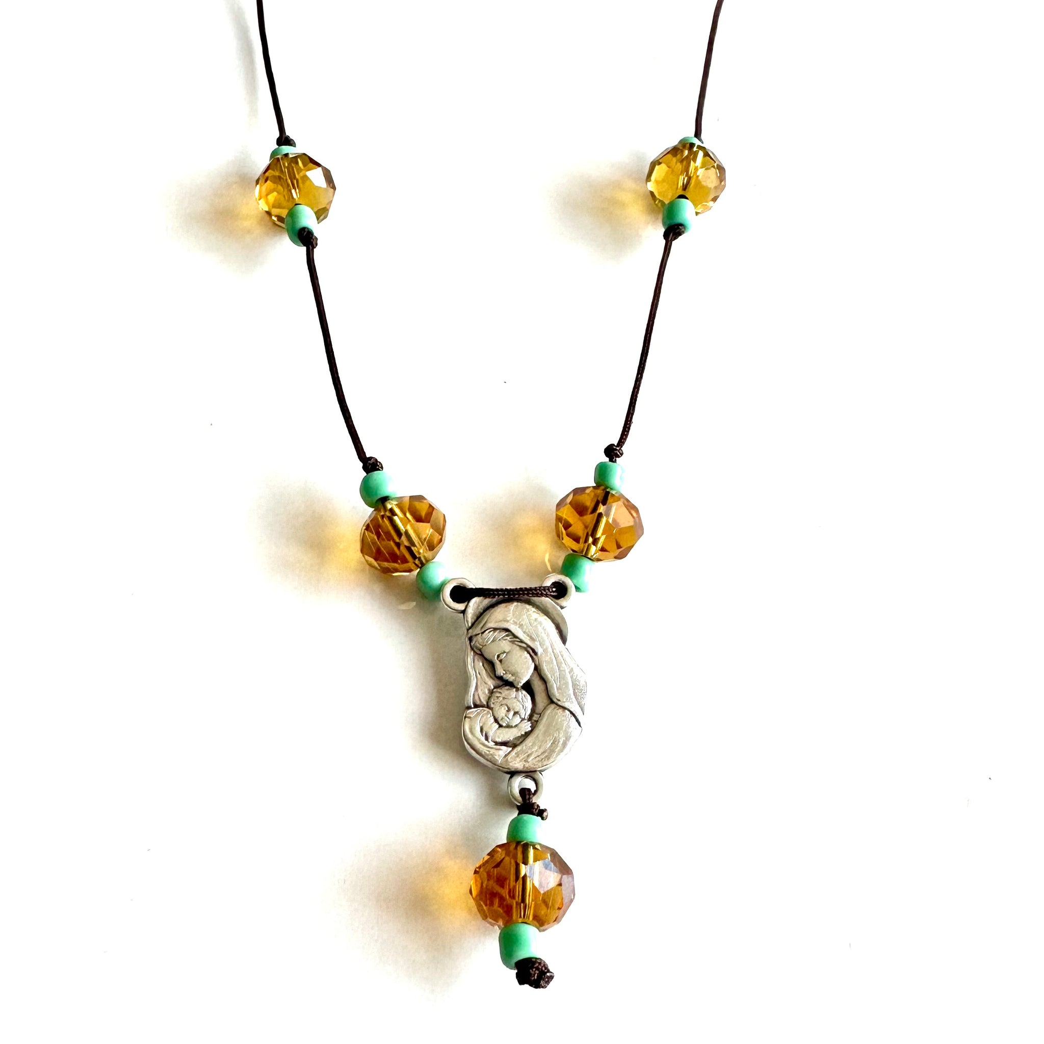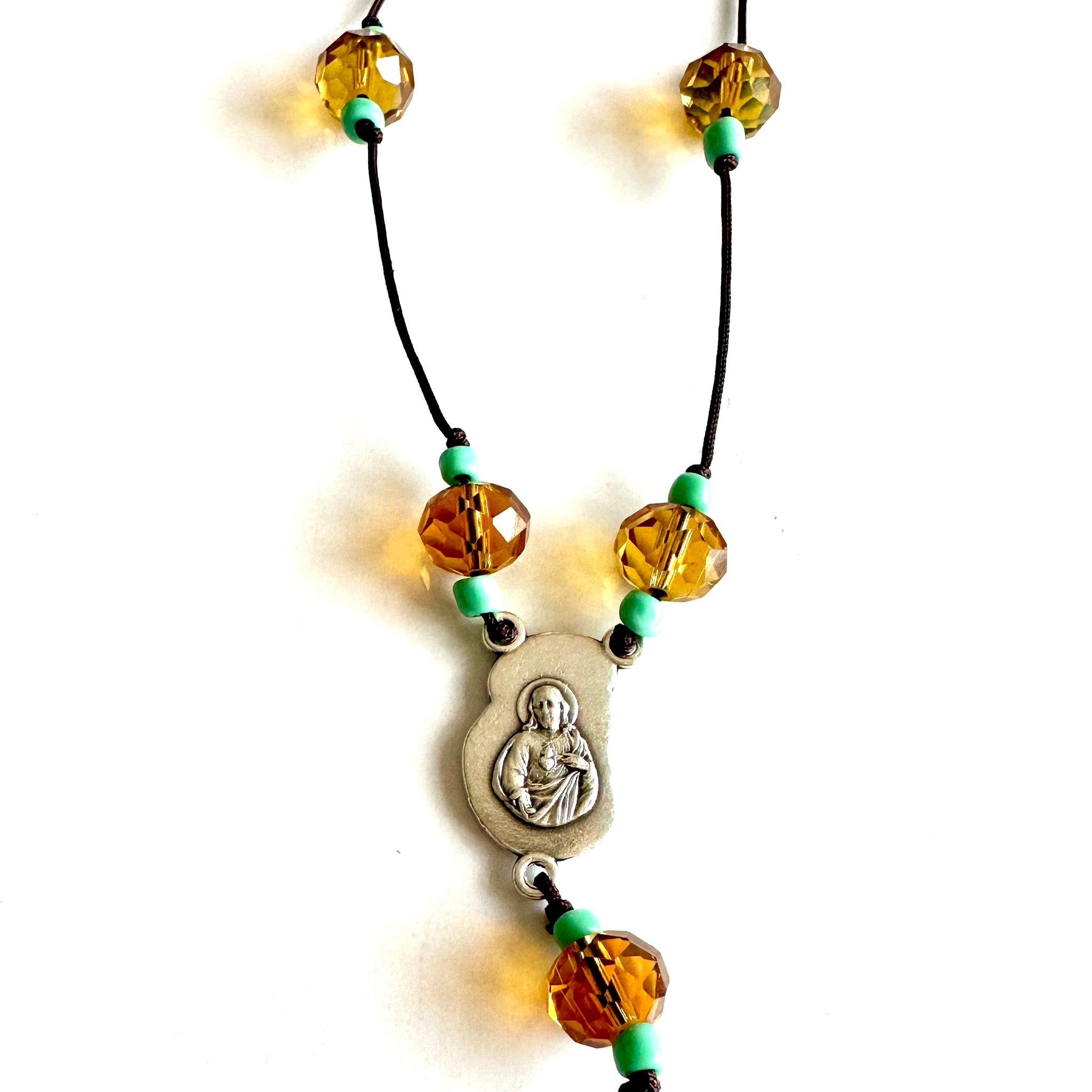🩵 Colgante “Berta”, cordón marrón formado por bolitas de cristal en color miel y turquesa. Le cuelga una medalla de zamac con la imagen en relieve del Sagrado Corazón por una cara y en la otra cara la imagen de La virgen con el Niño.