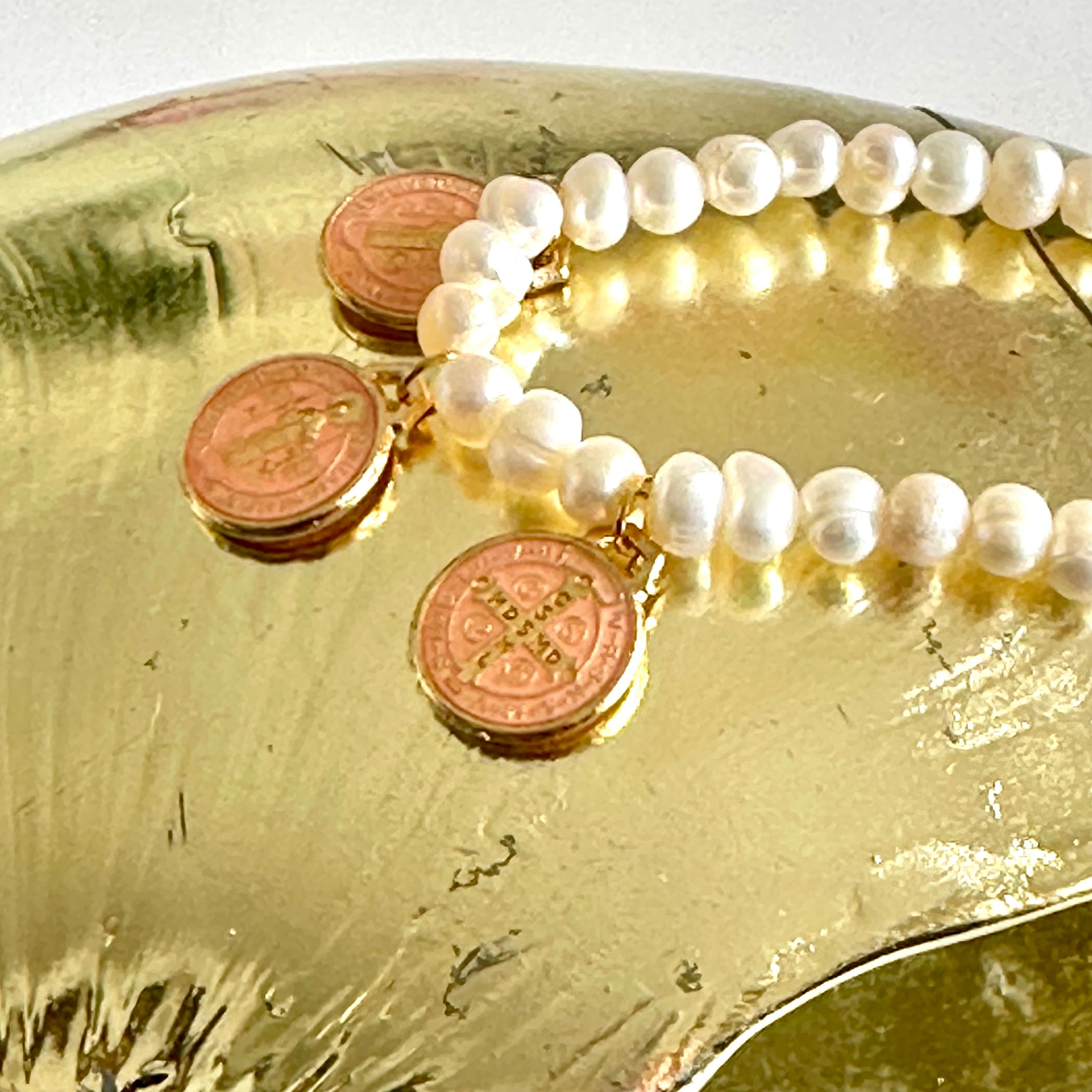 Pulsera de perlas y le cuelgan tres medallas de San Benito en color rosa.